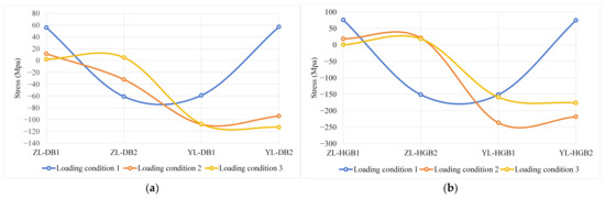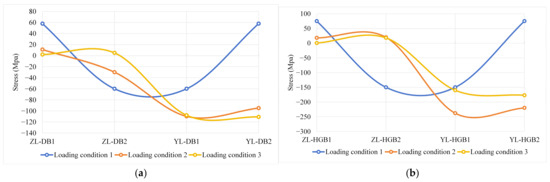 Figure 7 shows the simulated stresses at each test point under different loading conditions. Figure 8 shows the experimentally obtained stresses at each test point under different loading conditions. Table 4 exhibits the error between the simulated and experimental values. The results showed that the curves of the simulated results and the experimental results highly overlap with each other. It can be seen that the errors of the samples were all below 10%. The largest errors occurred at test points ZL-DB2 and YL-UL3 under loading condition 2, which might be due to loose strain gauges. On the other hand, the closer the test point is to the loading location, the higher the stress value, which is consistent with the real-world state of stress distribution. Overall, the FEM established in this paper is quite reliable, which could provide a solid foundation for the subsequent optimization of bridge components.
