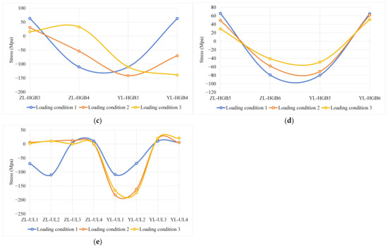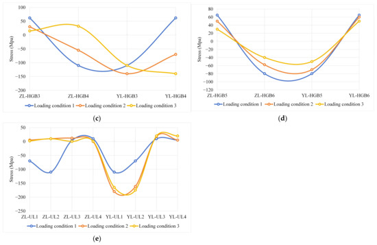 Simulated stresses of different components: (a) stresses at the bridge deck; (b) stresses at the junction of the diaphragm and bridge deck; (c) stresses at the upper opening of the diaphragm; (d) stresses at the lower opening of the diaphragm; and (e) stresses at the U-rib.