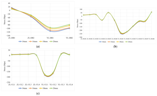Stress curves under different bridge deck thickness conditions: (a) stress curves of bridge deck; (b) stress curves of diaphragm; and (c) stress curves of U-rib.