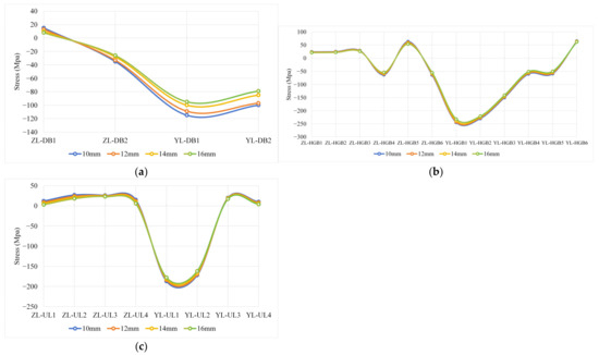 Stress curves under different diaphragm thickness conditions: (a) stress curves of bridge deck; (b) stress curves of diaphragm; and (c) stress curves of U-rib.