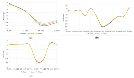The effect of diaphragm thickness on the stress of each component is shown in Figure 11. Table 7 exhibits the values at each test point. The results showed that the thicker the thickness of the U-rib, the lower the stresses of the components. The maximum stress reduction was observed when the thickness of the bridge deck increased from 6 mm to 8 mm. Meanwhile, the stress reduction decreased when the bridge deck thickness increased from 8 mm to 10 mm. So, the optimal thickness range was determined to be 6 mm to 8 mm.