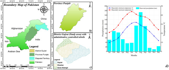 Spatial details of the district of Gujrat. (a) Location of the district of Gujrat on a map of Pakistan, (b) district of Gujrat map in Punjab province, (c) district of Gujrat map with the administrative controlled tehsils Sarai Alamgir, Kharian, and Gujrat, and (d) average climatic conditions.