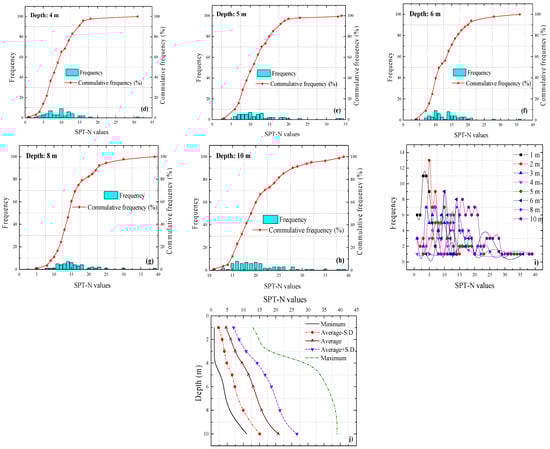 (a–f) SPT-N histogram at corresponding depths. (i) Comparison of SPT-N distribution at various depths. (j) Descriptive changes of SPT-N with depth.