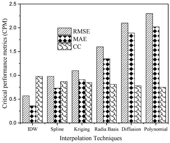 - The extensive iteration, the spatial analyst approach-based IDW, was found to be the most effective interpolation technique (OIT) with an RMSE, MAE, and CC ranging from 0.57 to 0.98. The least desirable method was polynomial interpolation, with an RMSE, MAE, and CC ranging from 0.73 to 2.5.
