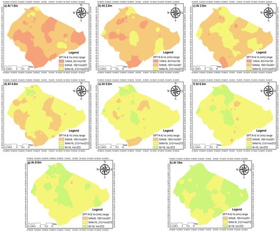 Figure 6 presents the soil resistance against compressive loading at depths of 1 m, 2 m, 3 m, 4 m, 5 m, 6 m, 8 m, and 10 m under the EGL. These SMs indicate the soil resistive capacity and soil stability against the loading at different intervals of the stratum. The classification of SPT-N values was based on the soil stiffness as suggested for soft, medium, and stiff soil. Eight maps were developed to analyze the stratigraphical changes of SPT-N across the shallow and deep intervals of depth. The observed ranges of SPT-N values, namely 1–16 for 0–3 m, 1–34 for 3–6 m, and 5–39 for 6–10 m, revealed increasing resistance with depth, consistent with stratigraphical densification. At a depth of 1.0 m, the majority of the area consists of soft zones with SPT-N values ranging from 1 to 4, indicating weak strata unsuitable for foundation placement. As the depth increases, these soft zones diminish, giving way to stiffer strata. For instance, at a 2 m depth, the SPT-N values increased to a range of 5 to 8, reflecting improved soil strength. This transition from soft to stiff behavior became more pronounced with depth; by 10 m, the majority of the area was characterized by significantly higher SPT-N values ranging from 9 to 16 and exceeding 16.