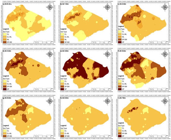SMs were created based on soil types identified at different stratigraphical layers of the study area. Soil types were classified according to the Unified Soil Classification System (USCS) and assigned numerical codes as follows: (1) CL, lean clay; (2) CL-ML, silty clay; (3) ML, silt; (4) SP-SM, poorly graded sand with silt; (5) SP, poorly graded sand. Based on the observed pattern of soil variation together with depth, nine maps were created, as shown in Figure 7. The depth intervals of the soil maps were 0 m, 1 m, 2 m, 3 m, 4 m, 5 m, 6 m, 8 m, and 10 m, respectively. The developed SMs demonstrated the predomination of CL and CL-ML soil in the shallow stratification (i.e., up to 3 m), which is consistent with the alluvial deposits formed by the sedimentation from the Chenab River and its tributaries, contributing to the fine-grained interbedded stratigraphical layers. Between 4 m and 6 m, the stratigraphical composition shifted significantly, with SP and SP-SM soils becoming more prevalent, indicating the presence of coarser-grained alluvial layers, possibly reflecting historical fluctuations in sediment deposition regimes.