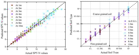 To assess the accuracy of the SMs at specific depths and locations, actual SPT-N values and soil types were compared with interpolated predictions generated via the optimized IDW technique. The borehole points reserved for validation were well-distributed across the study region to ensure comprehensive coverage, revealing only minor differences between the observed and predicted values, confirming the reliability and robustness of the IDW method for the development of SMs. Such SMs are critical to providing regional variation considering the regional variation in geological and geotechnical variation other than local anomalies. Figure 8 demonstrates the scatter plot of the field observations and predicted values, showing a more concentrated alignment at shallow depths (1–3 m below the EGL) that gradually became more dispersed at depths beyond 3.0 m. It is pertinent to mention here that the maximum variability between the actual and predicted SPT-N values in the first 3 m ranged between ±3. In order to further analyze the strength of the predicted SPT-N values and soil type, the RMSE, MAE, and CC were computed for various depths, as can be seen in Table 6.