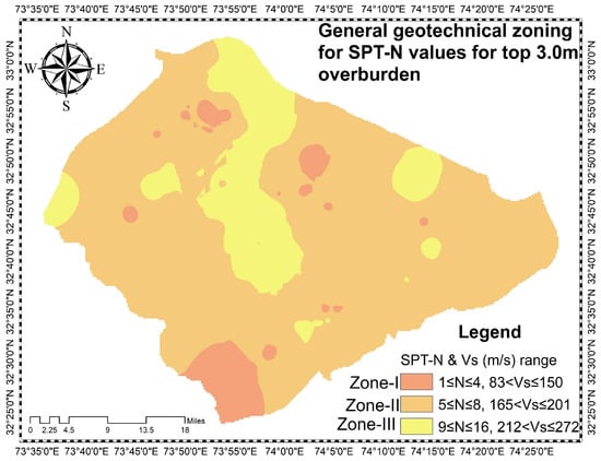 Laying the foundation of lightly-loaded structures within the first 3 m of the EGL is a common practice in Pakistan. Therefore, it is necessary to develop generalized geotechnical zones for the SPT-N value for the average of the first 3 m overburden, which provides a quick estimation of the soil parameters and bearing capacity for the local practitioners dealing with lightly-loaded structures, keeping in mind the economical constraints. In this context, an average SPT-N-based SM was incorporated based on the average SPT-N values of the first 3 m below the EGL, as seen in Figure 9. The stratification reflects the influence of the depositional environment and overconsolidation ratio, which directly impact the soil stiffness and strength properties. A total of three zones were proposed for soft, medium, and stiff consistency soils. For the top 3 m, the average SPT-N value in zone-I was 1–4; for zone-II, it was 5–8; and for zone-III, 9–16. Table 7, Table 8 and Table 9 present the average subsurface soil parameters based on field and laboratory investigations for the design of shallow foundations.