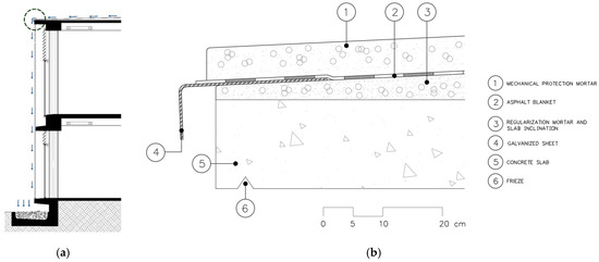 In terms of management and drainage, the configuration of the CDS roof directs the flow of rainwater to the ends of the mechanical protection, where it falls freely into a drainage channel located next to the first floor (Figure 1a). However, this solution is integrated with other details and specifications in the architectural design to ensure the required watertightness and prevent damage and anomalies, such as rainwater infiltrations, which reduce the functional aspects of the building and increase its risks to the users. This applies to the construction detail of the drips, which are installed all around the perimeter of the roof—both on the inside and outside edges (Figure 1b). Made of galvanized steel sheets (fragmented into rectilinear segments to adapt to the semicircular shape), they are inserted between the regularization layer of the concrete slab and the mechanical protection of the waterproofing, under the asphalt blanket, to guarantee their efficiency and prevent their attachment points on the slab from becoming possible points of water percolation and infiltration.