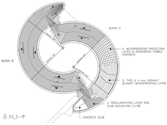The waterproofing plan (Figure 2) presents recommendations for the execution of the roofing system, including the mechanical protection sheets defined based on the slope diagram (with the watershed at the center) and the expansion joints in positions coinciding with the structural joints. Another specification is the arrangement of asphalt membrane strips, overlapped in the transverse direction and following the curvature of the building, to prevent the return or percolation of water through the joints.