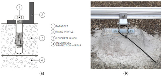 In addition to ensuring watertightness, the integration of the photovoltaic panels with the waterproofing system and the slab was meticulously planned to maintain their structural integrity. The supports for the solar panels’ metal profiles are fixed to concrete blocks positioned on the mechanical protection layer. These blocks are set with mortar, providing a solid and stable base for the supports and obviating the need for direct perforations in the waterproofing layer or the slab itself, as shown in Figure 3a.
