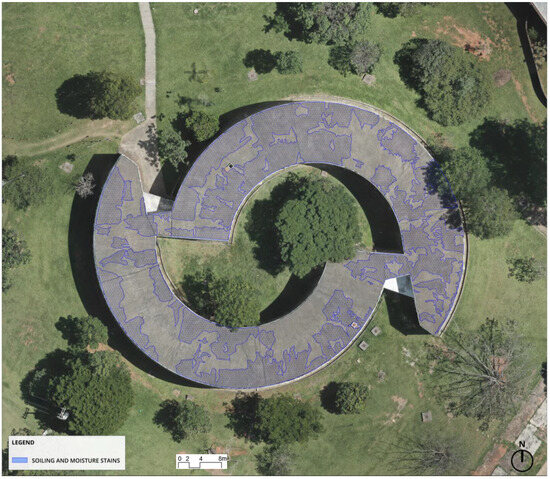 Figure 5 shows the damage map constructed from an orthoimage captured with the drone at the end of a rainy period. It identifies the main stains affecting more than 50% of the roofing system area, with emphasis on soiling stains from particle deposition and differential washing, as well as moisture stains resulting from the accumulation of rainwater due to problems in directing the flow. The lighter-colored stains, from the center to the edges, across the entire extent of the roof, are those caused by the carrying of dirt, while the darker-colored stains, which are deposited along the edges of the curves that shape the building, signal points of moisture retention.