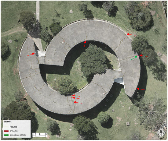 In this context, the main objective of this study was to investigate the relationship between pathological manifestations on the flat roof and the architectural details of the building’s semicircular shape, assessing the state of conservation of its elements and components, as well as the influence of structural design, construction processes, environmental factors, and active degradation mechanisms. In addition, the study produced qualitative damage maps to visually represent the evidence.