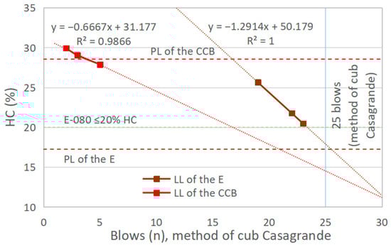 The Atterberg limits, understood as being the water content values that cause the material to exhibit plastic and liquid behavior, were set according to ASTM D4318-17e1 [53] (Figure 3). The plastic limit of a soil (UNE-EN ISO 17892-12 standard [70]) is the lowest moisture content with which the soil can be considered to have a plastic behavior. The liquid limit is the moisture content at which a soil, mixed with water, exhibits liquid behavior and some resistance to shear, tested using the Casagrande method (UNE-EN ISO 17892-12 standard [70]). According to the E-080 [48] standard, the HC used in the manufacture of the EB must not exceed 20%; if exceeded, this could lead to a loss of resistance in the EB. According to P. Wiehle et al. [71], the type and quantity of clay, as well as other parameters—such as the organic content—influence the HC of the soils, and in turn, the HC also influences the mechanical behavior of the EBs. Therefore, the results of the LL and PL established for the materials used were compared with those indicated in the E-080 standard in order to determine the optimal HC of the different dosages. In the case of LL regressions, both materials present an inverse sense of proportionality between the variables, with significant correlation coefficients R2 that could be considered very strong [72]; in the case of PL, it is evident that CCBs will require higher HC than E to achieve workable consistencies.