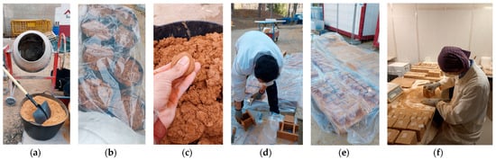 The manufacture of mixtures and specimens was carried out according to the specifications of the E-080 standard [48], making one type of mixture with homogeneous characteristics per day. H. Houben, in his book Earth Construction Technology [73], indicates the feasibility of making mixtures for earth construction by applying different mechanical methods, although he also indicates the risk of possible lump formation and a lack of homogeneity. This can be solved by means of the correct particle size combination, by determining and correcting the HC in the mixing, the introduction of the materials into the mixer in the correct order or sequence, and correct handling techniques.