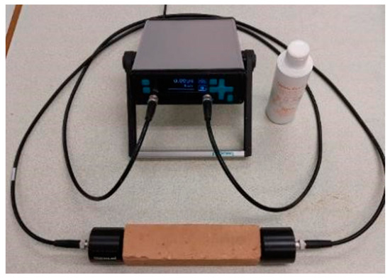The objective of this test is to measure pulse velocity by ultrasonic wave transmission (UPVs) induced by two transducers positioned at the ends of the study specimen. Using the UPV data, the property of the Elastic Modulus, also known as Young’s modulus (E∂), can be indirectly and quantitatively established. This test was carried out in accordance with the ASTM e 1876-01 [82] and UNE-EN 14146:2004 [83] standards, applied to seven available type A specimens and four type B specimens, in order to verify the effect of size on the results. The UPV used was the Pundit Lab (+) Proceq model, equipped with transducers and contact gel, a guarantee of the continuity of the interface. See Figure 5.