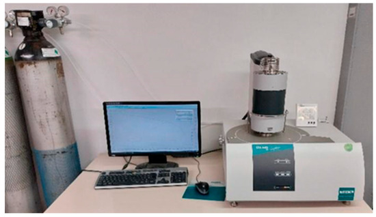 This was performed with a Netzsch STA 449 F5 Jupiter thermogravimetric analyzer (Figure 6). The study samples were simplified by sectioning representative sizes produced from manual crushing to samples equal to 5 g. Temperatures ranging from ambient temperature to 1000 °C were applied during the test, the heating rate was established as a constant equal to 10 °C/min, and the sample was subjected to a hydrogen atmosphere to avoid calcination due to the ignition of the components.