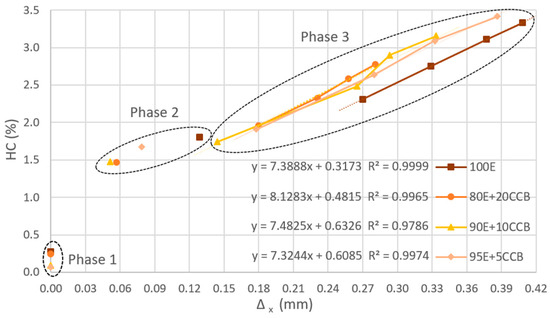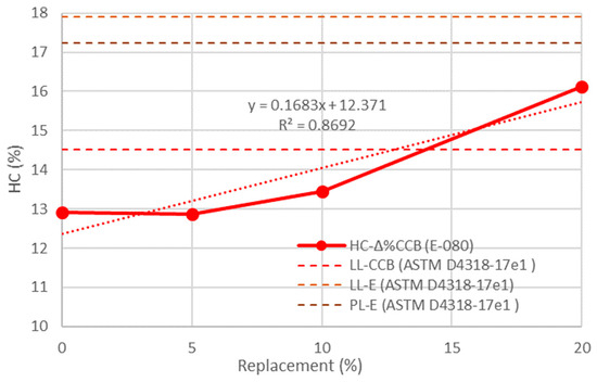 In the case of E, the LL values are projected with HC < 20%, which is not achieved in the case of CCBs. This could be adverse in the mechanical properties of EBs if their contents were high (predominance in behavior due to the predominance of the content). Therefore, in accordance with E-080, HC of 17.24% is established by extrapolation for E; a tendency to increase the HC is expected to be directly correlated with an increase in the replacement of E by CCBs in the other study mixtures, which will bring them closer to the Atterberg limits.