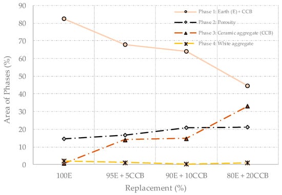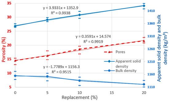 Figure 8 shows the results of the apparent solid density (1350.03, 1374.93, 1394.33, and 1429.87 kg/m3, respectively), bulk density (1154.44, 1151.98, 1135.24, and 1121.16 kg/m3, respectively), and pore content (14.49, 16.21, 18.58, and 21.59%, respectively) for the different study matrices. The observed relationships indicate that an increase in the replacement percentage produces an increase in the apparent solid density and pore content. Respectively, these are linked to the fact that the CCB is denser and its structure produces an increase in porosity [40]. On the other hand, the increase in CCBs in the study matrix will produce a decrease in the bulk density, as this is established considering the pores present in the materials.