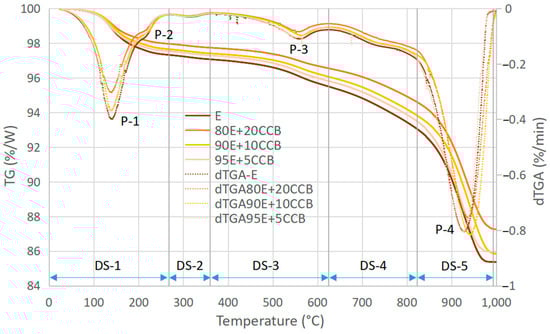 The granulometric analyses of E, CCBs, and the mixtures with the different replacements of E by CCBs are within the limits of the soil texture diagram spindle. Thus, they have established themselves as aggregates with particle grades suitable for use in the EB factory [51].
