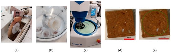 Next, after drying, all specimens except for D and E had their faces polished with No. 80 and 180 sandpaper in order to eliminate surface irregularities and to ensure accurate measurements and readings in the subsequent tests. Finally, the weight and dimensions of each specimen were determined again.