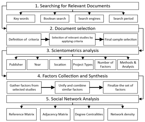 The research methodology of this study comprised 5 interconnected stages, each contributing significantly to the overall analysis, as illustrated in Figure 1. The first stage, “Searching for Relevant Documents”, involved a thorough data collection process, which was marked by an extensive review of the existing literature on cost overruns to identify the various causes of cost overruns. This thorough literature survey formed the foundation for the subsequent stages, ensuring a broad and in-depth understanding of the current knowledge in the field.