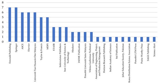 The initial phase of the scientometric analysis involved examining the distribution of studies across various academic publishers, providing a well-rounded view of the research on construction cost overruns. Notably, seven studies were published by Emerald Publishing and Springer, while six studies were published by the American Society of Civil Engineers (ASCE), Elsevier, and Universiti Tun Hussein Onn Malaysia, showing the global interest in this topic. Taylor & Francis and MDPI have each published five studies. Furthermore, the remaining 27 studies were distributed across other publishers, as shown in Figure 3.