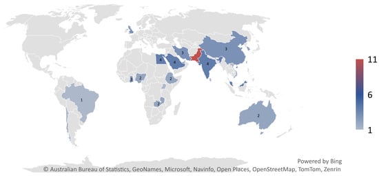 Regarding the geographical distribution of the studies included in this analysis, it was observed that they covered a wide range of continents, as shown in Figure 4, reflecting the global nature of cost overrun phenomena in the construction sector. The Asian continent led the list of regions with a total of 45 studies, with Pakistan contributing to 11 research papers, making it the most represented country in this category. Asia was followed by Africa with 14 studies, then Europe with 4 studies. North America, South America, and Australia each contributed two studies.