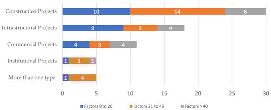 The number of ranked cost overrun factors analyzed showed a diverse range of study scopes. Exactly 25 studies examined 8 to 20 factors, targeting key contributors to cost overruns. An additional 29 studies analyzed 21 to 40 factors, offering a broader analysis. The remaining studies investigated over 40 factors, reflecting a comprehensive examination of cost overrun causes in construction projects. The variation in the number of factors examined across different project types is clearly illustrated in Figure 5, highlighting the distribution of ranked factors across construction, infrastructural, commercial, and institutional projects.