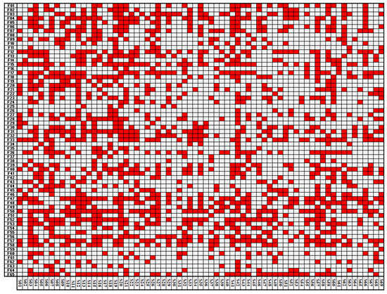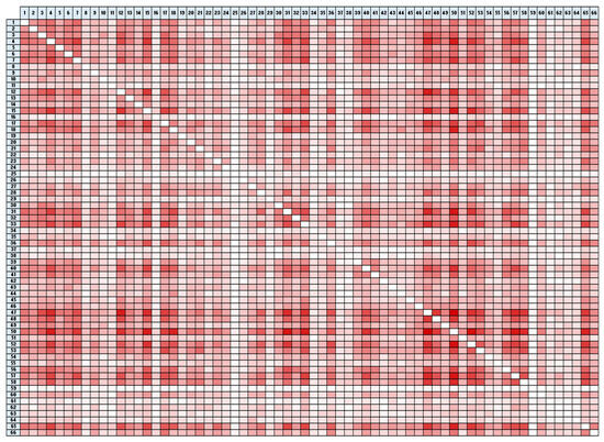 The resulting matrix highlighted the co-occurrence of the 66 cost overrun factors within studies, indicating the degree to which factors were connected based on their joint presence in the literature. Figure 8 shows the actual adjacency matrix, which was developed to visually represent the interconnections among the various nodes. Each cell within the color-coded matrix mirrors the values found in the corresponding cell of the adjacency matrix. The rows and columns of the color-coded matrix correspond to the factors being analyzed, making it easier to assess the correlation strength between any pair of intersecting factors. The color scheme used in this matrix indicates the strength of the connections between factor pairs, with darker shades signifying stronger connections.
