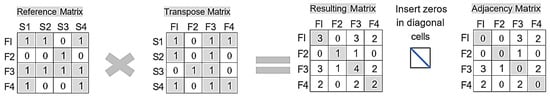 An adjacency matrix is a crucial step in the Social Network Analysis (SNA) process, representing the connections between various nodes. This matrix is developed by multiplying the reference matrix by its transpose, as shown in Equation (1), and setting the diagonal entries of the resulting matrix to zero to avoid self-connections.