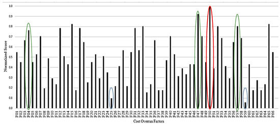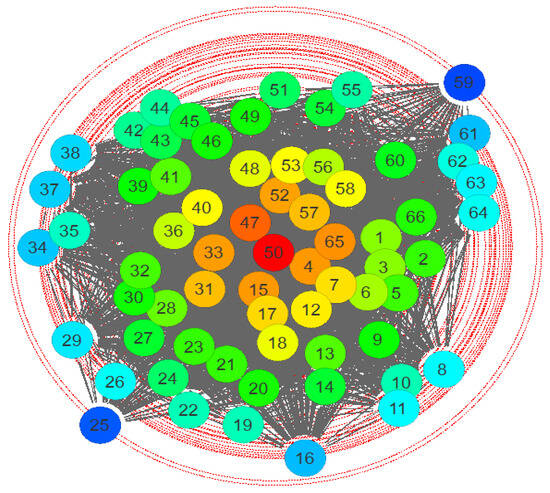 The colors in the network diagram represent the range of degree centrality, transitioning from blue at the periphery to red near the center as shown in Figure 9. For instance, factor F50 (planning and scheduling issues), located at the center of the network with the highest normalized DC as presented in Figure 10, is highlighted in red, indicating its significant importance compared to other factors. Similarly, factors F47, F15, and F4 (project estimation problems, design inefficiencies, and labor availability and skills), which are also near the center with normalized DC values of 0.922, 0.824, and 0.804, respectively, are marked in orange, indicating their relatively high centrality. In contrast, factors such as F25 and F59 (delayed payment by contractor and security), positioned at the periphery and indicated in blue, exhibit a lower DC, reflecting their lesser importance within the network. These peripheral factors have fewer connections and reduced influence, while the central red and orange nodes represent the core of the network, where the most influential factors are concentrated.