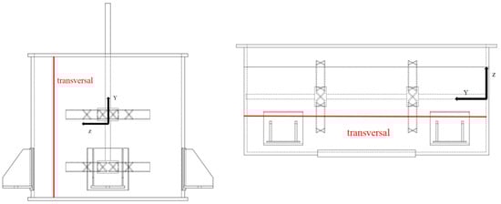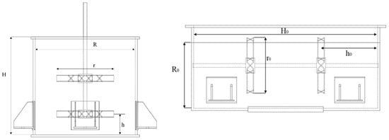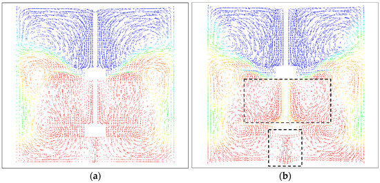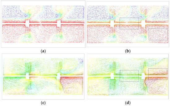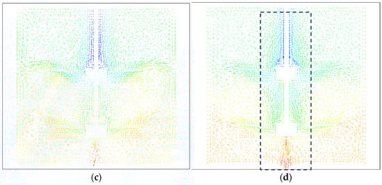 Figure 12 to provide a more thorough representation of the fluid change pattern inside the stirrer. When a double-layer folded-blade paddle stirred generally, the vertical shaft stirrer created two vortices in the upper part of the mixer and close to each layer of paddles. An extra pair of vortices was created in the space between the double-layer paddles in the process of vibration agitation. In addition, there was a larger vertical velocity vector near the mixing shaft’s side and the bottom of the mixing vessel. The presence of more radial velocity vectors in the upper part of the mixer and in the region between the two blades compensated for the weak mass transfer capacity in the vertical and radial directions of the respective regions, as can be seen from the concentrations in the transversal direction at different radial distances (
