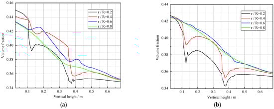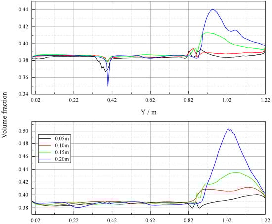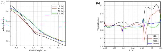 Figure 8). For the vertical shaft mixer with a 100 Hz vibration mixing process compared to the static stirring process without vibration, the maximum volume fraction of the solid phase at the transversal direction decreased by 1.8%, and the minimum volume fraction increased by 1.1%.