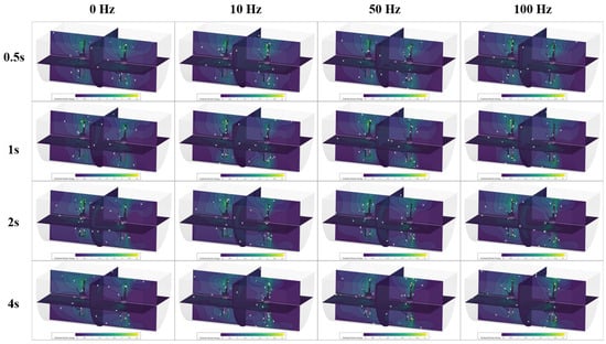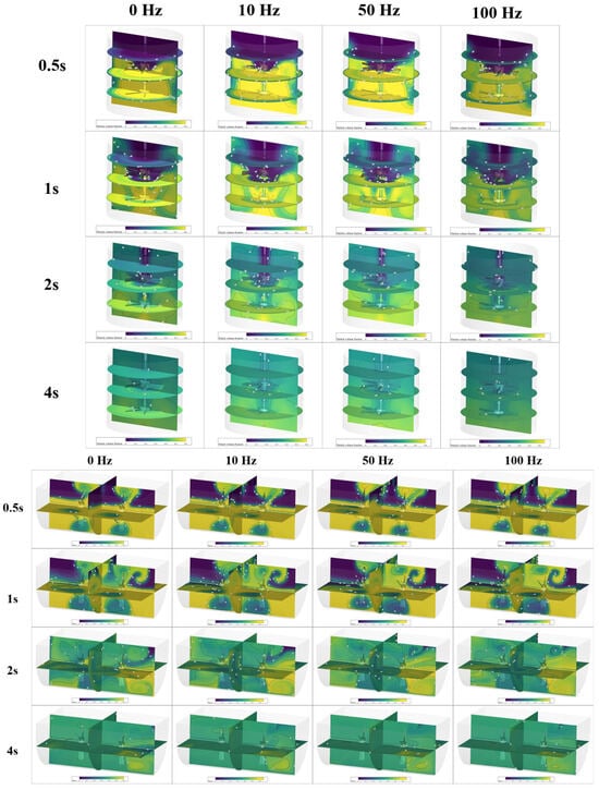 Figure 9 illustrates the variations in solid-phase particle concentration distribution at the initial stage of mixing for different excitation frequencies. In the case of the vertical shaft mixer, the mixer was vertically divided into four equal parts by means of the upper, middle, and lower cross-sections. The cement particles moved from the bottom of the mixer to the liquid-phase region under the axial thrust of the folded blade paddle, then spread to both sides of the wall of the mixing tank and settled downward, forming a round of cyclic flow, with solid–liquid mixing occurring throughout. At 0.5 s, a number of cement particles in the mixer with 100 Hz vibration-assisted mixing reached the upper cross-section, and its average concentration reached 12.58%, while the average concentration in the upper cross-section during static mixing was only 6.03%. The concentration of cement particles retained in the upper part of the mixer with high-frequency vibration at 4 s was also higher. In the case of the horizontal shaft mixer, a small portion of the cement particles were carried from the bottom to the upper part of the vessel by the rotation of the mixing blades at the beginning of mixing. After that, due to the overall rotational movement of the slurry flow field, most of the solid-phase particles moved up to the upper part of the vessel with the rotation of the flow field, and then, the slurry fell back to the bottom of the mixer by its own gravity and inertia, completing a mixing cycle. Due to the structure of the folded blade paddle, the process of mixing the fluid produced an axial flow, but limited by the direction of rotation. At 4 s, the direction of axial movement of the fluid was in only one side, and the solid particles on the other side of the blade was prone to the hoarding phenomenon, as shown in