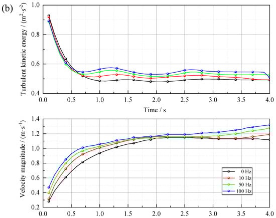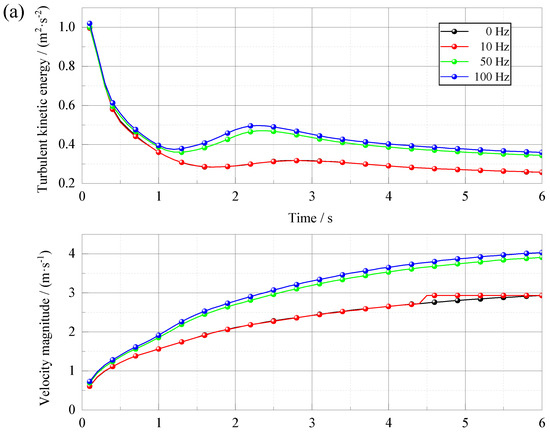 Figure 10. The average turbulent kinetic energy and velocity magnitude in the mixer at various excitation frequencies did not vary significantly at the start of the mixing period, and as the stirring time increased, the turbulent kinetic energy and velocity in the fluid domain tended to stabilize. Obviously, the system’s total turbulent kinetic energy and velocity magnitude were still higher than the value of static mixing because of the constant input of external excitation energy. An enhanced energy transfer in the flow field within the mixer, a heightened material exchange, and an increased mixing effect were all indicated by the rise in turbulent kinetic energy. For the vertical shaft mixer, when the vibration frequency was increased from 0 to 10 Hz, the overall average turbulent kinetic energy and velocity magnitude in the outer domain increased minimally, and when the vibration frequency was doubled from 50 Hz to 100 Hz, the values increased by only 2% and 3.06%, respectively. Much more energy from the pneumatic exciter for a slight improvement in mass transfer velocity was not cost-effective. However, when the excitation frequency was increased from 10 Hz to 50 Hz, the average turbulent kinetic energy and velocity size distribution were increased by 33.85% and 33.44%, respectively, and the mixing efficiency was significantly improved when the excitation frequency shifted to the mid-frequency band. Under all four frequency circumstances, the turbulent kinetic energy increase for the horizontal axis mixer was comparatively smooth and fell between 3% and 10%.