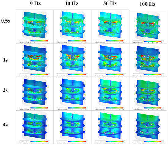 Figure 11 shows the turbulence energy distributions at the beginning of mixing under different excitation frequencies. At the start of mixing, almost all areas of the vertical shaft mixer had large turbulent kinetic energy, and the solid–liquid mixing material exchange process was intense, with extreme values of turbulent kinetic energy near the mixing blades. As the mixing time grew (2–4 s), the region of high turbulent kinetic energy shrank to the near paddle area, but for the case of high-frequency vibratory mixing. It can be clearly seen from the cloud diagram 10 that the top of the mixing vessel was still maintained in the state of high turbulence kinetic energy, which was extremely beneficial for the circulation of the two phases in the vessel as well as for the exchange of substances between the top and bottom of the high-concentration and low-concentration regions.