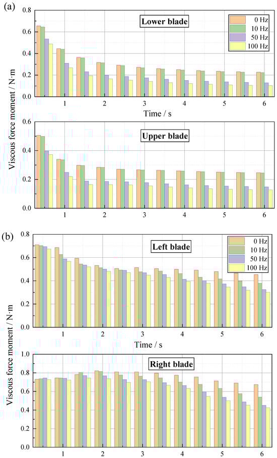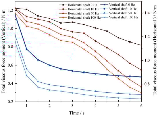Figure 16 shows the magnitude of the moments caused by the viscous forces on each layer of blades within the two structures of the mixer. In the vertical shaft mixer, the concentration of solid phase particles was high in the bottom part of the container at the start of mixing, and the lower blade’s viscous moment was much higher than the upper blade’s. As the mixing time increased, the fluid flow rate grew, the Reynolds number increased, and the viscous force moments of the two blade layers decreased and tended to stabilize. The viscous force moment of vibration mixing was smaller than that of static mixing. The reduction was not large at 10 Hz, whereas the moment was more significant at medium- and high-frequency vibration. The viscous force moments of the upper and lower blades at 50 Hz decreased by 39.74% and 43.02%, respectively, compared with that of the ordinary mixing, and the viscous force moments of the vibration mixing at 100 Hz decreased by 48.21% and 54.60%, respectively. For the horizontal-axis stirrer, it had a good stirring state on the left where the solid phase concentration gradually decreased to a more uniform phase, while on the right side of the vessel in 1.5 s–2.5 s some of the solid-phase particles were deposited at the bottom of the vessel, the local phase density was high and the flow rate was low. The right side of the blades subjected to the viscous moment increased slightly before it gradually decreased and stabilized. However, unlike the vertical shaft mixer, the reduction in the viscous force moment caused by low-frequency and high-frequency vibration was more significant, but with the increase in vibration frequency, the reduction in viscous moment magnitude was diminished. The total viscous moment decreased by 31.25% between 0 and 50 Hz, but only by 6.37% between 50 and 100 Hz, which was inefficient when considering energy usage. In the whole vibration agitation process, for the vertical shaft mixer, under the three different excitation frequencies of 10 Hz, 50 Hz, and 100 Hz, the average magnitudes of decrease in the viscous force moment of the stirrer, i.e., the energy saving brought about by it, were 2.4%, 33.85%, and 43.01%, respectively, and for the vertical shaft mixer, they were 7.09%, 13.15%, and 17.12%, respectively. The reason for this difference may be that for the vertical shaft mixer, the excitation energy input to the system was relatively small at low frequencies and the main area of influence of vibration agitation was the bottom of the vessel. With a certain increase in frequency, there was an improvement, but when the frequency continued to increase, high-frequency vibration wave in the cement slurry viscous attenuation was more pronounced, reducing the magnitude of the enhancement in the mixing effect. As for the horizontal shaft mixer, the mixing shaft and the two blades were close to and at the same distance from the excitation source. The area was more strongly affected by the excitation source accounts for a larger proportion of the overall volume, though the excitation energy was more horizontally dispersed. Its vertical dimension was smaller than the horizontal dimension, the attenuation of the vibration wave in the vertical direction was not as significant as the vertical axis mixing, and the improvement of the mixing effect brought about by the increase in frequency was also relatively average. Overall, as shown in