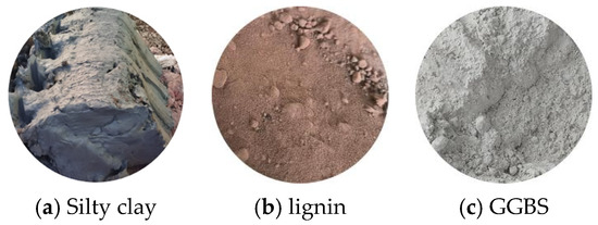 The silty clay, lignin, and BFS (Figure 1) used in the test were all taken from Lianyungang City, Jiangsu Province, China; the basic physical indicators are shown in Table 1 and Table 2. Lignin was obtained from a byproduct of a local biomass processing enterprise in Lianyungang. The lignin waste generated during the production process of the enterprise was collected and initially treated for this experimental study, aiming to explore its application potential in improving the performance of silty clay and realize the resource utilization of waste. Lignin is a brownish-yellow powder with a special aromatic odor. It is a polymer anionic surfactant with strong dispersibility, adhesion, and coordination. It mainly contains active functional groups, e.g., alcohol hydroxyl groups (-OH, 3374 cm−1), benzene ring C=C bonds (651, 880, 1593 cm−1), alkanes (C-H(CH2), 1423, and 1593 cm−1), primary alcohols (R1-CH2-OH, 1050 cm−1), and secondary alcohols (R1-CH(R2)-OH, 1090 cm−1) [45]. The relative density of lignin is usually between 1.35–1.50, it is optically inactive and has a refractive index, is soluble in water, and has most common organic solvents in its natural form. The viscosity of lignin solutions is generally low, has thermoelectricity, and the softening temperature is usually between 120–200 °C. When lignin contains water, its glass transition temperature (Tg) is significantly reduced. As a polymer anionic surfactant, lignin can change the particle distribution, enhance the soil deformation resistance, and create good conditions for the subsequent reaction. By forming covalent bonds with clay minerals and promoting the BFS hydration reaction, the soil strength is enhanced to better withstand external pressure. In terms of water stability, it regulates water distribution and migration, stabilizes the aggregate structure, reduces expansion and dispersion when it meets water, and performs well in the freeze-thaw cycle.