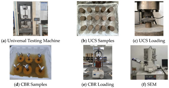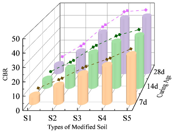 CBR test and rebound modulus test: the samples (φ152 mm × h170 mm) were measured at 7, 14, and 28 d for CBR and rebound modulus following Chinese standard JTG 3430-2020 [47]. The CBR and rebound modulus were measured with a strength meter, and the loading rate was 1 mm/min.