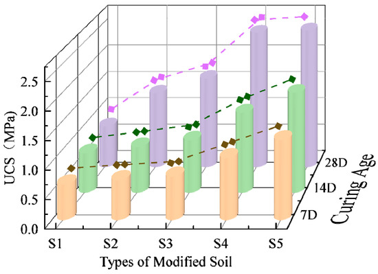 Figure 3 shows the UCS of the samples at different curing ages. At the same curing age, the addition of lignin-BFS significantly improves the UCS of silty clay. With the decrease in lignin content and the increase in BFS content, the UCS increases first and then becomes stable. After 28 d of curing, the UCS of the S2–S5 samples increased by 1.8 times, 2.18 times, 3.31 times, and 3.36 times, respectively, compared to the S1 samples. In the curing process, lignin locks water by attracting clay particles to form aggregates and promotes the formation of BFS hydration products, thus filling the internal pores of the soil and improving the strength of the soil.