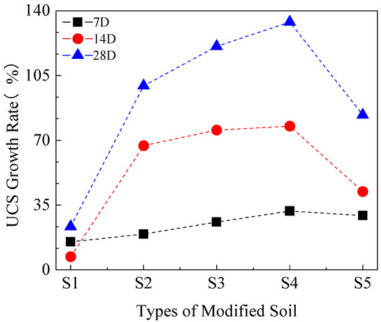 Figure 4 shows the variation of the UCS growth rate of the sample. At the same curing age, with the decrease in lignin content and the increase in BFS content, the UCS growth rate increases first and then decreases, indicating that there is an optimal amount of lignin and BFS. Among the five groups of the samples, the UCS growth rate of the S4 samples is the highest, which indicates that the content of lignin and BFS in the S4 samples is the best. Excessive lignin content will occupy the position of soil particles, leading to incomplete hydration reactions. Insufficient lignin will prolong the hydration reaction cycle of BFS, resulting in insignificant growth of the UCS. Moreover, the larger the proportion of BFS, the more the active components in BFS cannot fully hydrate, which has little effect on the strength growth of soil. Therefore, there is a balance point between lignin and BFS content. In addition, the reaction between the modifier and silt clay is most rapid from 14 d to 28 d. The reason for this is that the strength of BFS increases slowly without the action of strong alkaline activators [41]. With the increase in curing time, the internal hydration products increase, resulting in a higher rate of soil strength growth.