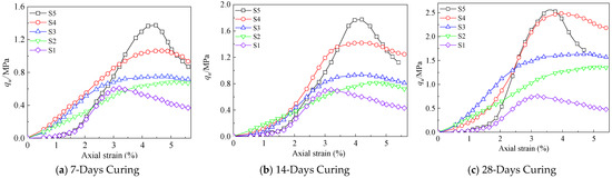 Figure 5 shows the stress-strain curves at different curing ages. At the same curing age, the peak stress of the S2–S5 samples is significantly higher than that of the S1 sample. There are significant differences in the stress-strain curves of the S2–S5 samples. As the lignin content decreases and the BFS content increases, the stress-strain curves of S2–S5 transition from strain-softening to strain-hardening. At the same curing age, the peak stress of the unmodified S1 sample was significantly higher than that of the lignin-GGBS-modified S2–S5 sample. At the same time, the stress-strain curves of S2–S5 samples showed significant differences. With the decrease in lignin content and the increase in GGBS content, the curves showed a change from strain-softening to strain-hardening. During the 7-day curing period, each curve shape initially showed this trend (as shown in Figure 5a).
