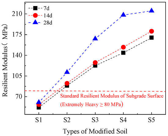 From Figure 6, Figure 7 and Figure 8, it can be seen that the addition of lignin-BFS significantly improves the CBR and rebound modulus of silty clay. As lignin content decreases and BFS content increases, the CBR and rebound modulus first increase and then flatten, and the CBR growth rate first increases and then decreases at the same curing age, which is roughly the same as the law of the UCS. There is a certain correlation between CBR and UCS [49]. After 28 d of curing, the CBR of the S1~S5 samples is 6.42%, 16.64%, 34.67%, 42.95%, and 44.28%, respectively. The CBR and rebound modulus of S2~S5 meet the requirements of subgrade filler for expressways in the Chinese standard JTG D50-2017; S1 samples do not meet the requirements [50]. The CBR growth rate of S4 was the highest (60.56%), indicating that the ratio of lignin and BFS in the S4 sample was the best. During the 14- to 28-day curing period, the rebound modulus of S4 increased the fastest, increasing by 63.94 MPa. The total increase in the rebound modulus of S2 and S5 was close to the increase in S4, indicating that the effect of composite improvers on improving soil is better than that of single improvers.