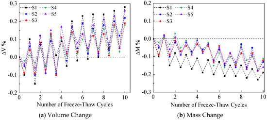 From Figure 9, it can be seen that during a single freeze-thaw cycle, both the volume and mass of the samples show a trend of first decreasing and then increasing, exhibiting a phenomenon of freeze-shrinkage and thawing expansion [51]. In general, with the increase in freeze-thaw times, the volume of the sample showed an increasing trend, while the mass showed a decreasing trend.