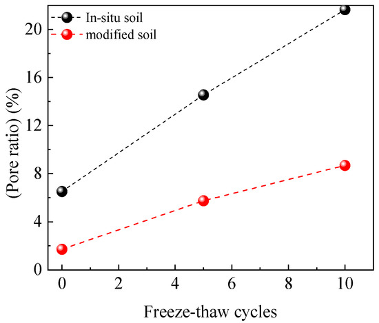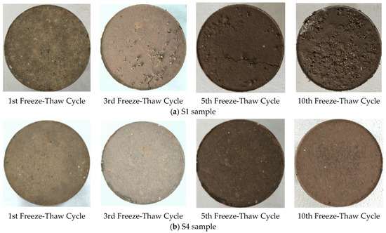 Figure 10 shows the apparent changes of the S1 sample and the S4 sample during the freeze-thaw cycle. With the increase in freeze-thaw times, soil particles fell off, and cracks occurred on the surface of the S1 sample first, and then surface cracks gradually expanded. After 10 freeze-thaw cycles, the cracks inside the samples were connected, and the soil particles on the surface significantly fell off. However, during the freeze-thaw cycle, the surface of the S4 sample had no obvious soil particle shedding and cracks, showing significant freeze-thaw resistance.