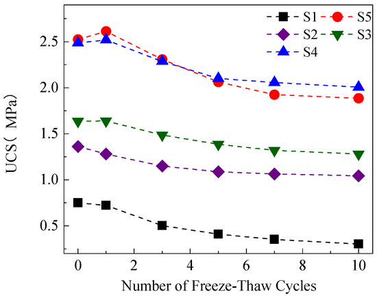 The relationship between the number of freeze-thaw cycles and the UCS.