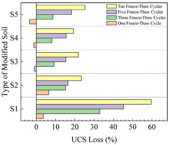 From Figure 11 and Figure 12, it can be seen that after 10 freeze-thaw cycles, the UCS of S2–S5 was 1.04 MPa, 1.28 MPa, 2.01 MPa, and 1.89 MPa, respectively, significantly higher than that of S1 (i.e., 0.3 MPa). The UCS losses of samples S2–S5 were 23.4%, 21.8%, 19.3%, and 25.3%, respectively, significantly lower than that of S1 (i.e., 59.6% MPa). These indicate that the addition of lignin and BFS can improve the soil’s freeze-thaw resistance.