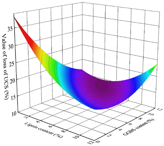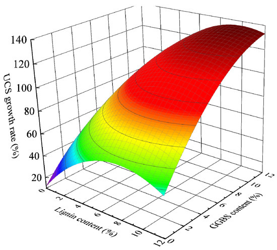 To further clarify the effects of lignin and BFS content on the mechanical and freeze-thaw properties of silty clay, the linear regression method was used to analyze the growth rate of UCS after 28 days of curing and the loss rate of UCS after freeze-thaw cycles [52]. The interaction between the two factors is shown in Figure 13 and Figure 14. With the increase in lignin and BFS content, the response surface curve of UCS growth rate showed a trend of first increasing and then decreasing, and the response surface curve of the UCS loss rate during the freeze-thaw cycle showed a trend of first decreasing and then increasing, indicating that there was an optimal proportion of lignin and BFS content. Through linear regression, under the condition of an improver dosage of 12%, the UCS growth rate was the largest when lignin: BFS = 4.17%:7.93%, and the UCS loss rate after freezing and thawing was the smallest when lignin: BFS = 4.128%:7.972%. The above results are close to the ratio of modifiers in the S4 sample. Therefore, when lignin: BFS ≈ 4%:8%, the soil improvement effect is most significant and the freeze-thaw resistance is the highest.