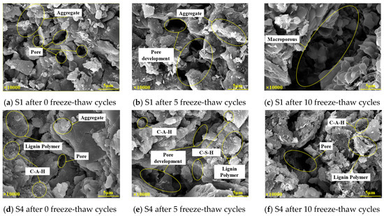As seen in Figure 15b,e, after five freeze-thaw cycles, the original surface-to-surface contact aggregate structure of the S1 sample gradually breaks down, and the clay minerals shift from a directional structure to a disordered structure. The effect of the bonding structure between particles in the S4 sample was weakened, the soil particles wrapped by the gelled products were gradually eroded, and the bonding efficiency of the gelled products was destroyed. The aggregate skeleton structure was gradually loosened, the surface particles fell off, and small pores appeared. From Figure 15c,f, after ten freeze-thaw cycles, cracks and large holes appeared inside the S1 sample, and the integrity of the soil was damaged. In the S4 sample, some aggregate particles were damaged, small pores and cracks increased, and no cracks appeared, so the sample was relatively complete. In general, compared to the S1 sample, the S4 sample exhibits better overall integrity and tighter agglomeration after freeze-thaw cycles. Under the action of the cementation of hydration products and skeleton construction, the soil structure of the S4 sample remains uniform and dense, which prevents the continuous damage of the soil microstructure caused by the freeze-thaw cycle. Therefore, the modified soil samples show strong structural stability and damage resistance under the action of the freeze-thaw cycle, and the integrity and density are significantly better than the undisturbed soil.